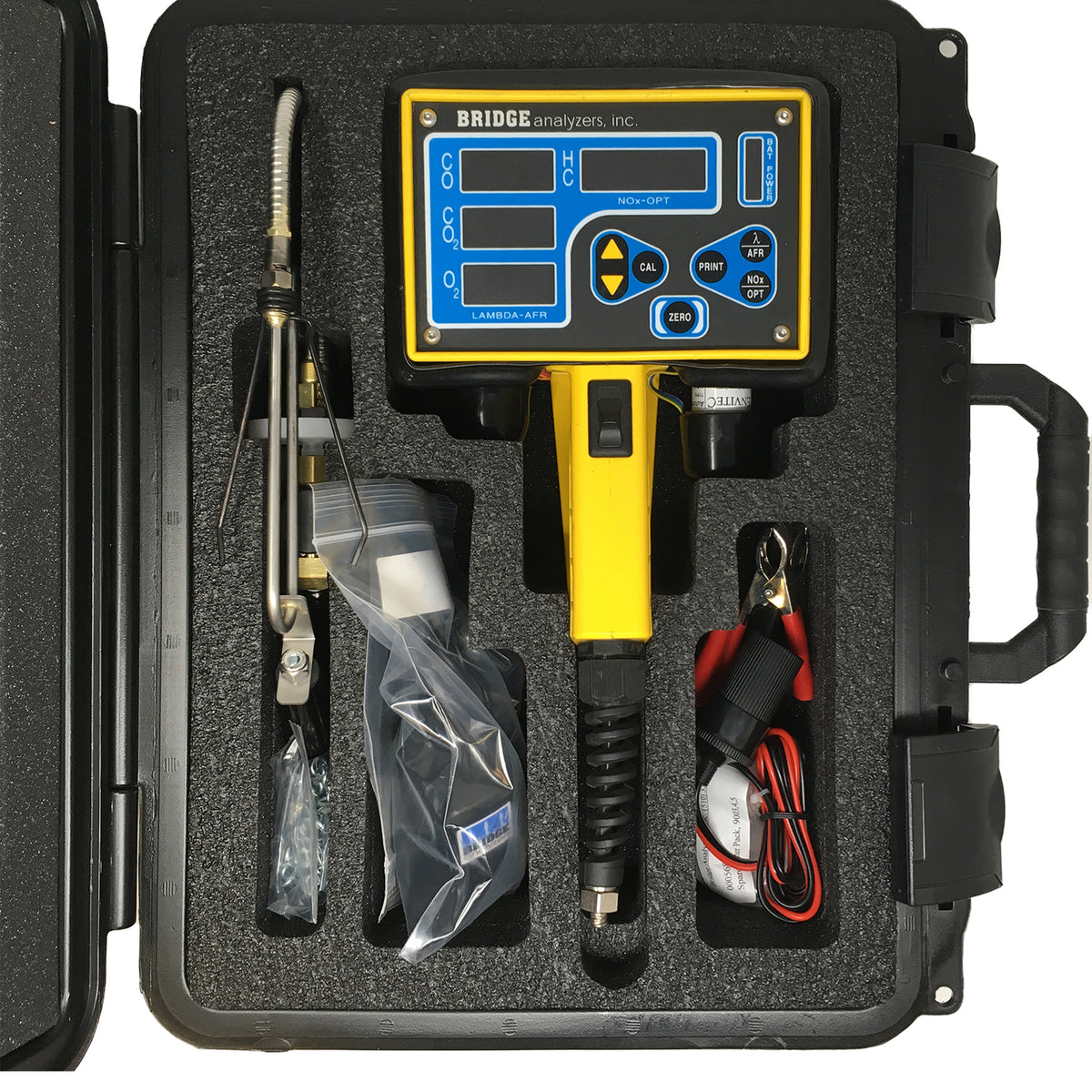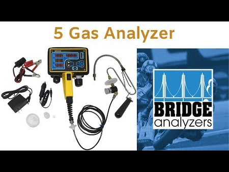 The Bridge Analyzers 5-Gas Analyzer is a professional-grade tool for measuring vehicle exhaust emissions, providing accurate diagnostics to ensure engines run efficiently and comply with emissions standards. This analyzer measures Carbon Monoxide (CO), Carbon Dioxide (CO2), Fuel-Dependent Hydrocarbons (HC), Oxygen (O2), and Nitric Oxide (NOx), giving your technicians a complete picture of tailpipe emissions.<p>Designed for immediate use, the analyzer comes in a hard carrying case with all necessary accessories, including a stainless steel probe assembly, sample line, built-in water trap, and particulate filters to protect the internal infrared optics. Setup is simple: turn on the power switch, connect the hose and probe, and push the Zero button. Once zeroing is complete, the analyzer is ready to measure exhaust emissions. Three power input options allow recharging of the internal batteries for versatile use in the shop or on-site.