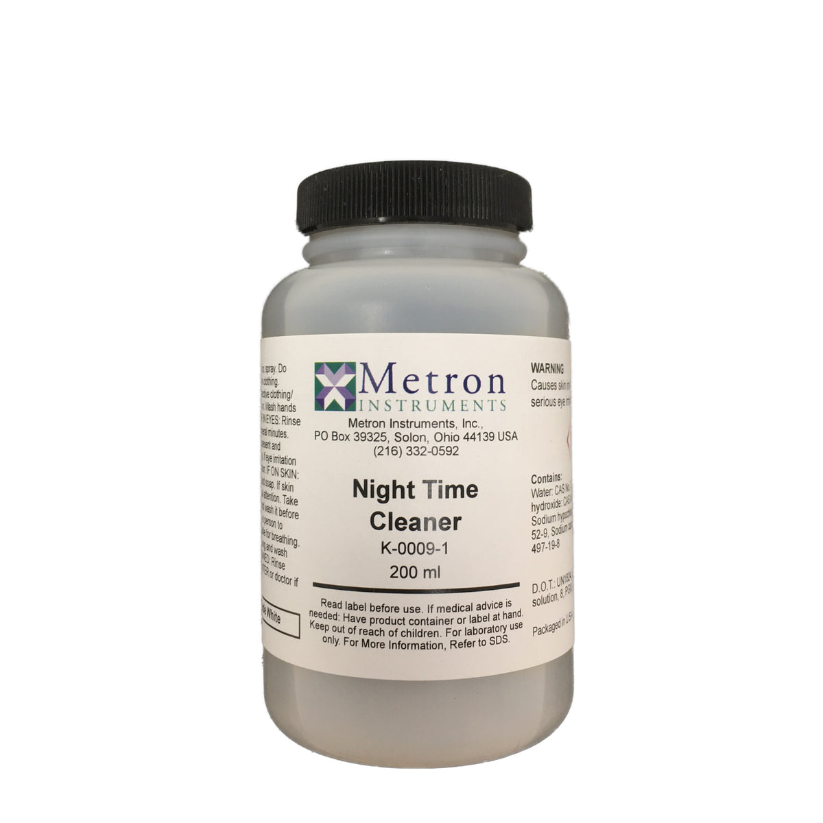 The Metron Night Time Cleaner (p/n K-0009-1) solution is a concentrated cleaning solution to be used as an end-of-day cleaner. This cleaner keeps the standardizer cuvette and other parts fully cleaned for long term use.